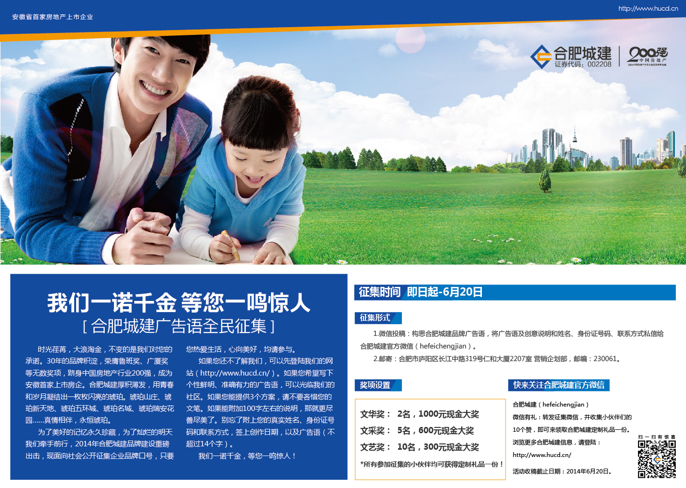 以诚为本赢在诚信9001是国家一级资质和AAA级信用等级的房地产开发企业,安徽省首家房地产上市企业(证券代码:002208)。 根据业务发展需要,拟面向社会、高校公开招聘下列工作人员,招聘详情见附件。 以诚为本赢在诚信90012014年人才招聘公告.doc